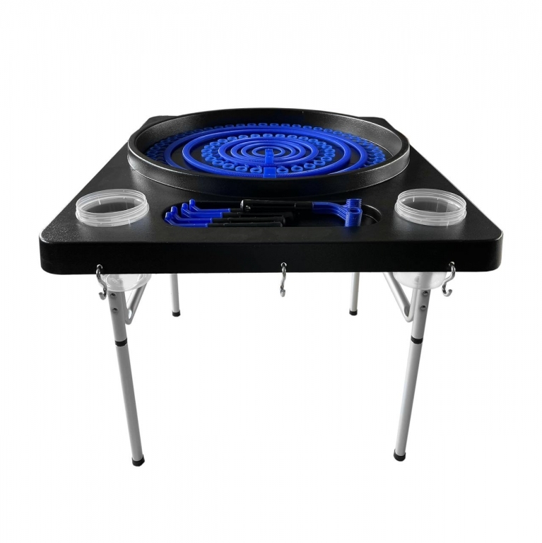 Антивандальный пластик Титановые ножки Стол 70 на 85 см Емкость для жидкости 60 см глубина 4.5 см 3 крючка для крепления инвентаря Слив для жидкости 1/2 дюйма 2 емкости стакана глубина 20 см диаметр 10 см Площадка для мелкого инвентаря 10 на 36 см